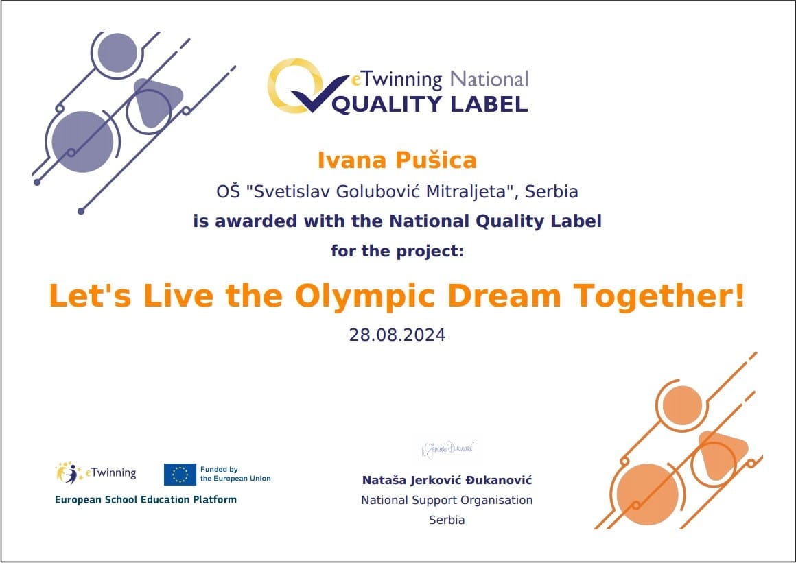 У петак, 13. 9. 2024, на националној eTwinning конференцији „Добробит у школама – темељ успешног образовања” учествовале су наставнице Ивана Пушица и Александра Даниловић. Током пре поднева одржана су пленарна предавања где су излагале доц. др Снежана Вуковић из Министарства просвете, представљајући приручник „Васпитање у функцији добробити и целовитог развоја деце” и Ана Мирковић, психолог, која је говорила о „Добробити деце и наставника”. Током после поднева рад је настављен у четири паралелне радионице. Национална конференција је била прилика да буду додељене националне ознаке квалитета за пројекте за протеклу школску годину, па су се међу лауреатима нашле и наставнице Ивана и Александра из ОШ ,,Светислав Голубовић Митраљета“. Тако је двогодишњи рад у пројекту ,,Let’s Live the Olympic Dream Together“ награђен с разлогом.