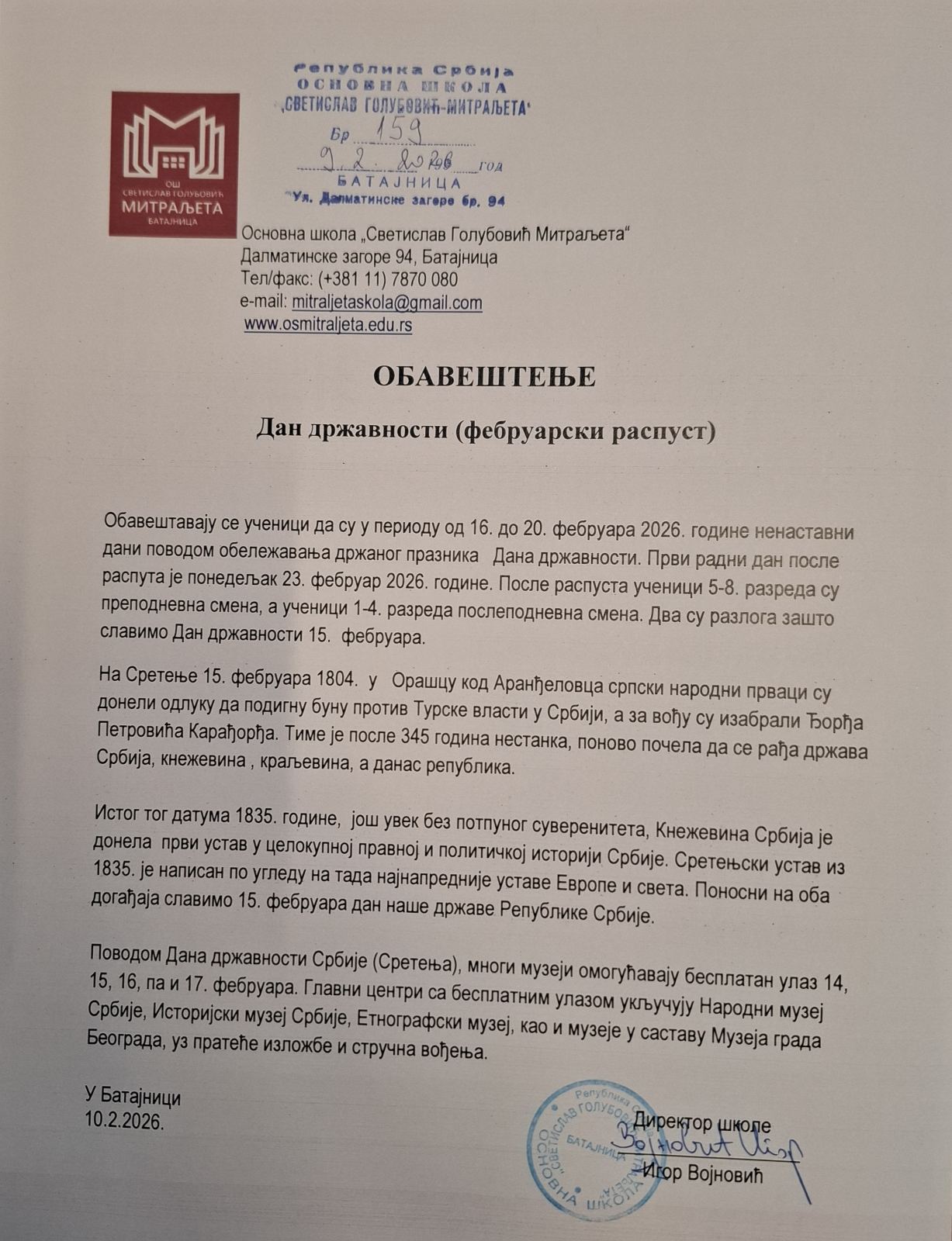 Обавештење 10. фебруар 2026. Дан државности (фебруарски распуст) Дан државности (фебруарски распуст): Поделите