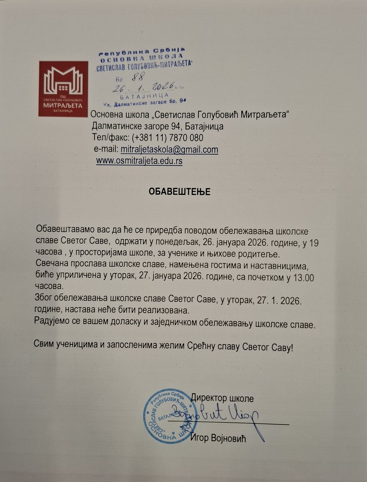 Обавештење за прославу школске славе Свети Сава