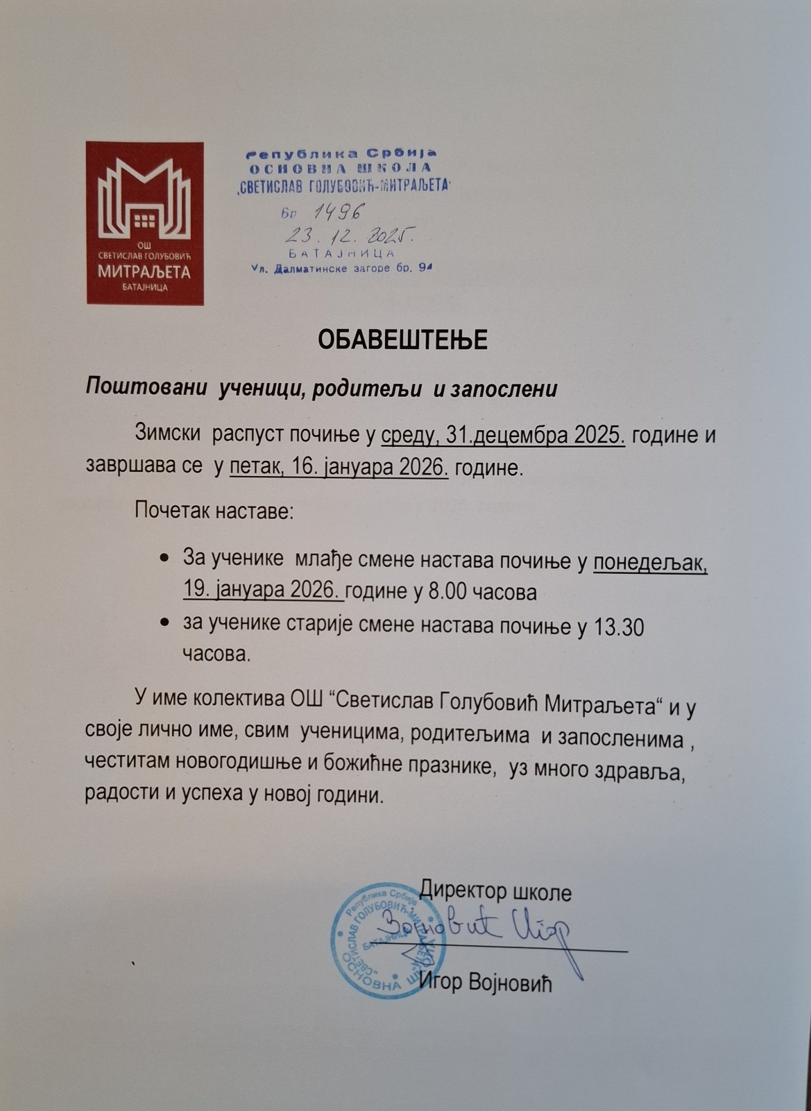 Обавештење за зимски распуст: