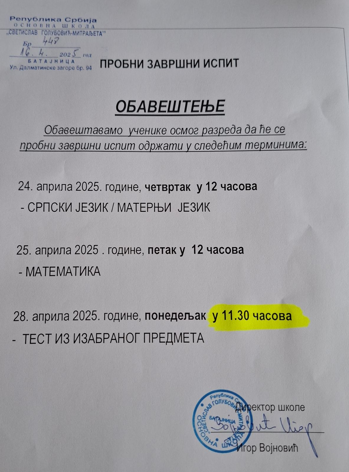 Обавештавамо ученике осмог разреда да ће полагање пробног завршног испита бити у следећим терминима: