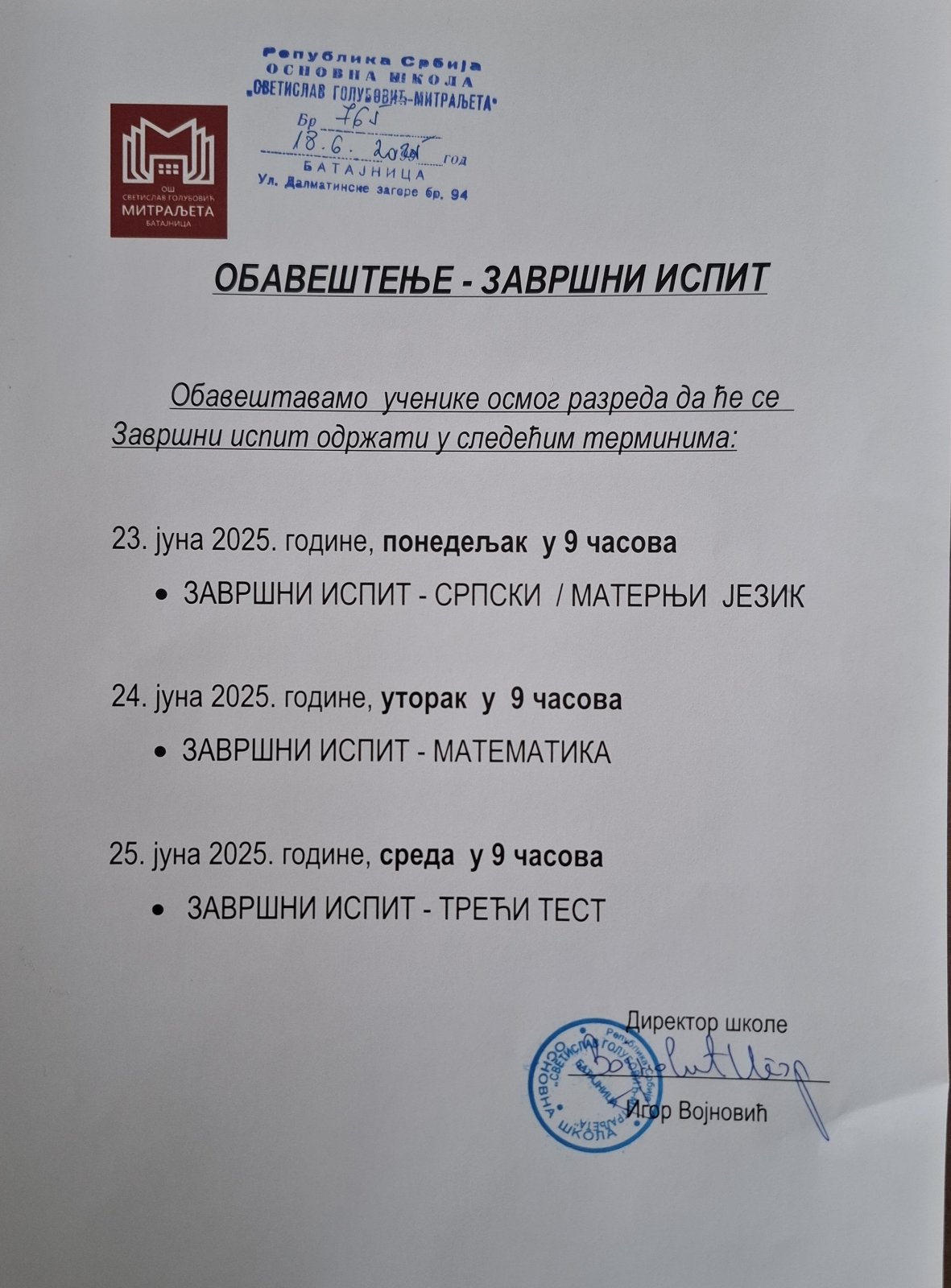 Обавештавамо ученике осмог разреда да ће се полагање Завршног испита одвијати по следећем распореду: