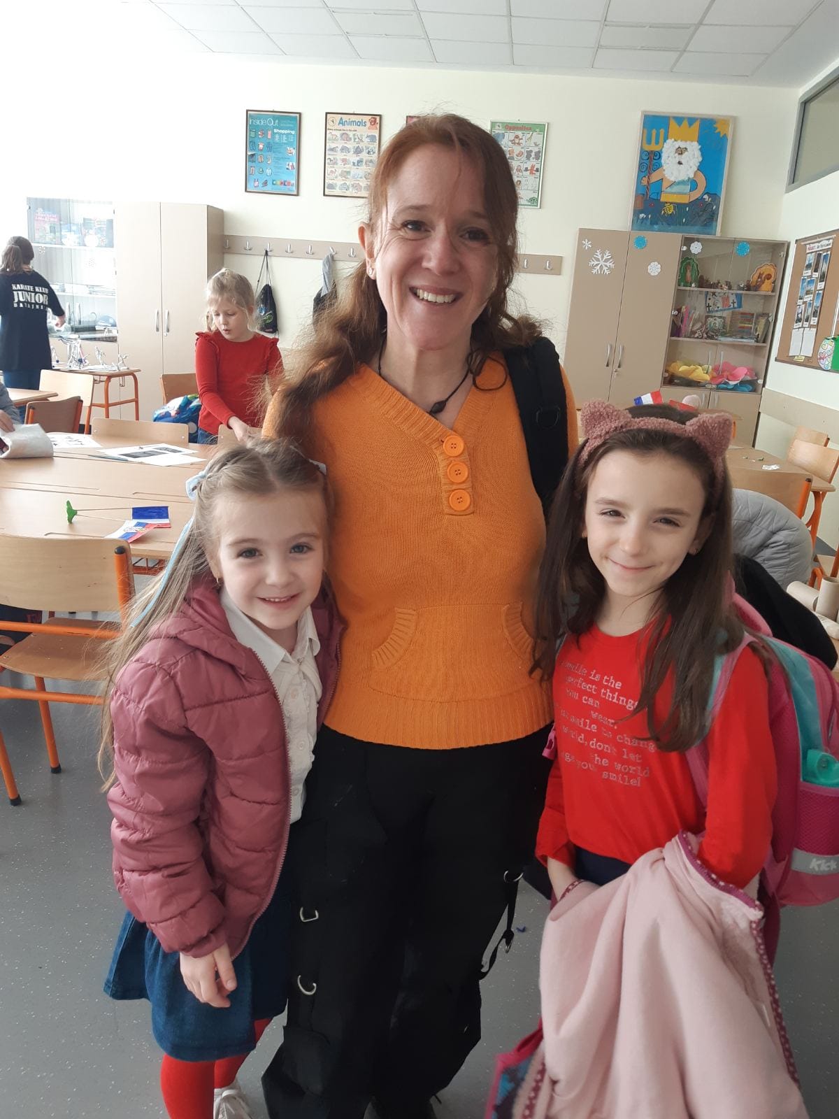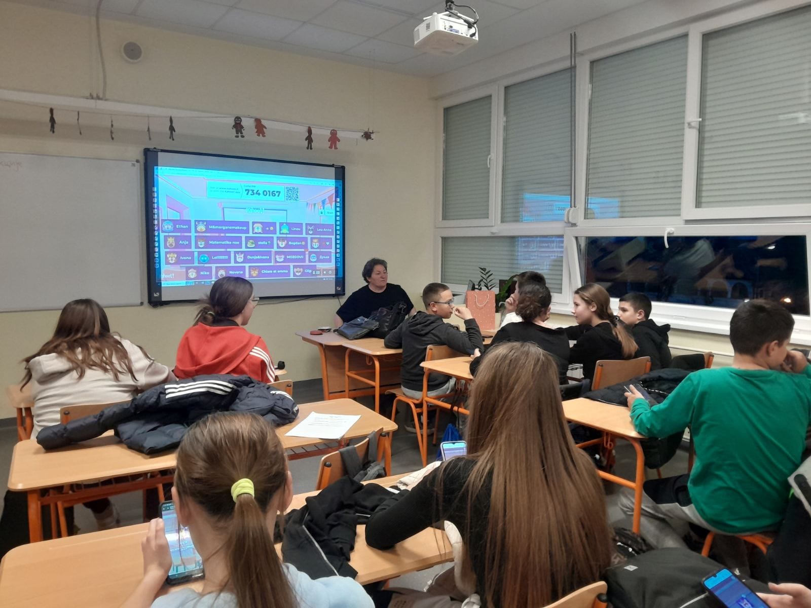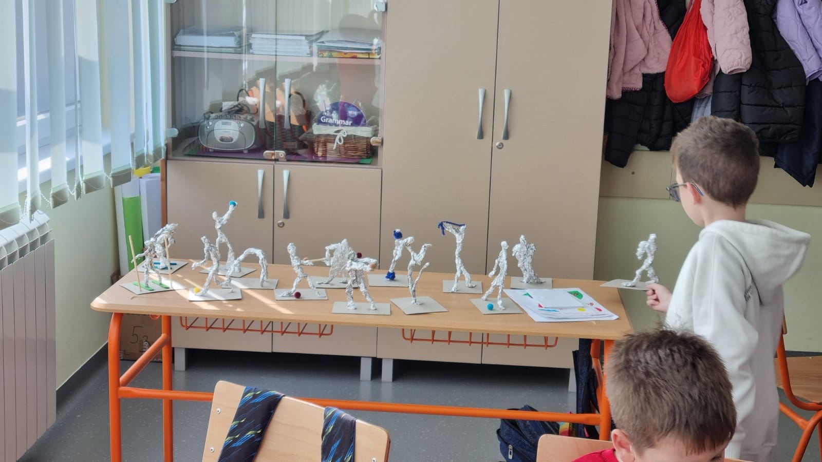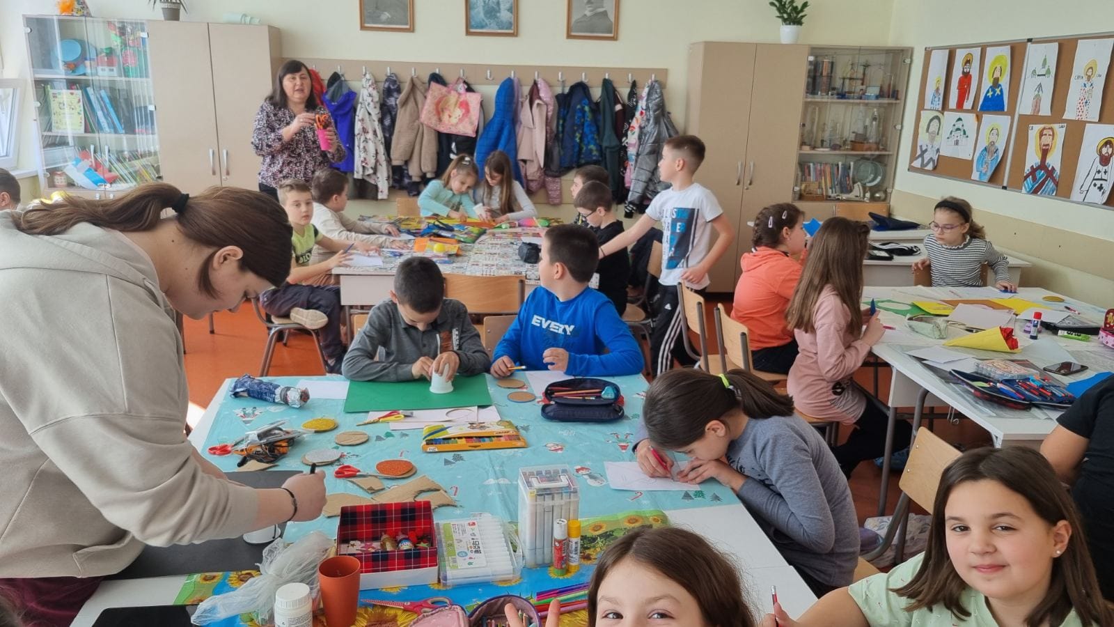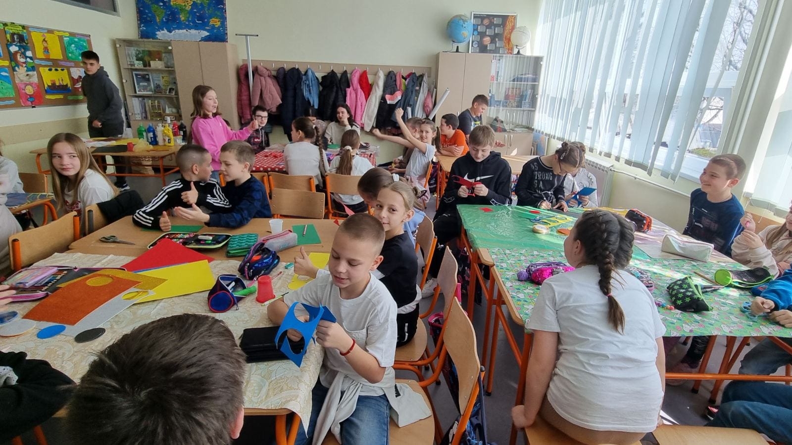 У жељи да сазнамо што више о образовним системима у којима радимо и учимо, данас смо за наше госте испланирали више активности у самој школи. Јутарња смена је ове недеље млађа смена, тако да су приликом доласка у школу наши гости подељени у три учионице. Једна група је била у 1/4, које је цело било обучено у бојама заставе, код учитељице Жане Перић, друга у 3/2 код учитељице Бојане Јањанин, а трећа у 3/4 код учитељице Биљане Поповић. Три креативне учионице. У једној су се правиле фигуре свих спортова на Олимпијади и златне медаље, у другој се увежбавао плес и правиле су се медаље, а трећа је показала шта је креативност у прављењу различитих медаља. Циљ радионице је био прављење симбола Олимпијских игара.