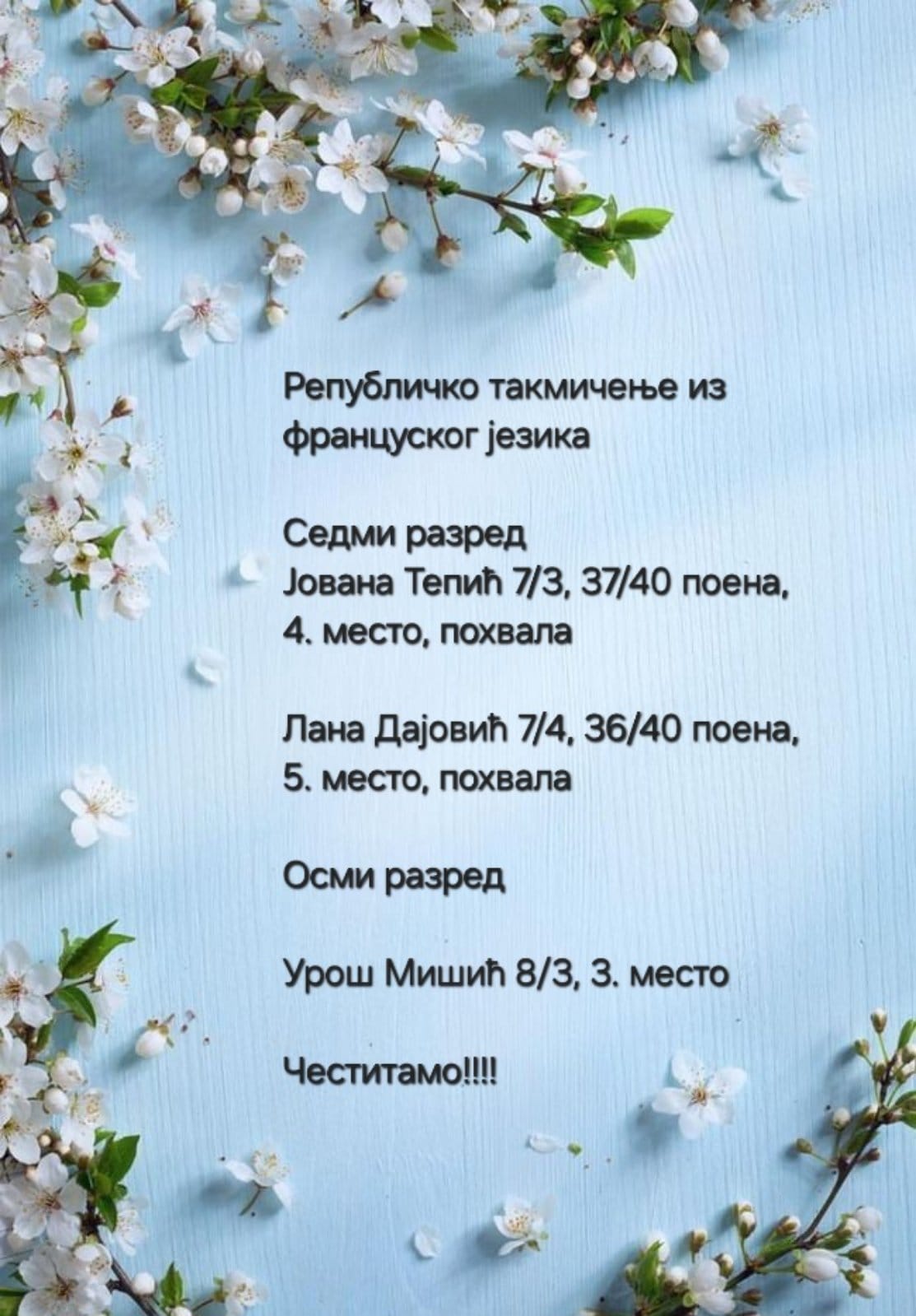 Вести, Такмичења 6. април 2024. Републичко такмичење из француског језика Све честитке ученицима и наставници француског језика Марини Драгић! Поделите