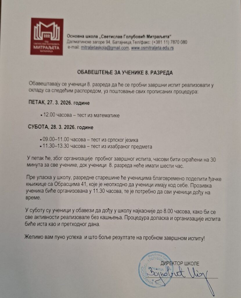 - Испит из МАТЕМАТИКЕ почиње у 13 часова, 25.3.2022. године. Ученици су у обавези да дођу у 12 часова испред ОШ“Бранко Радичевић“.